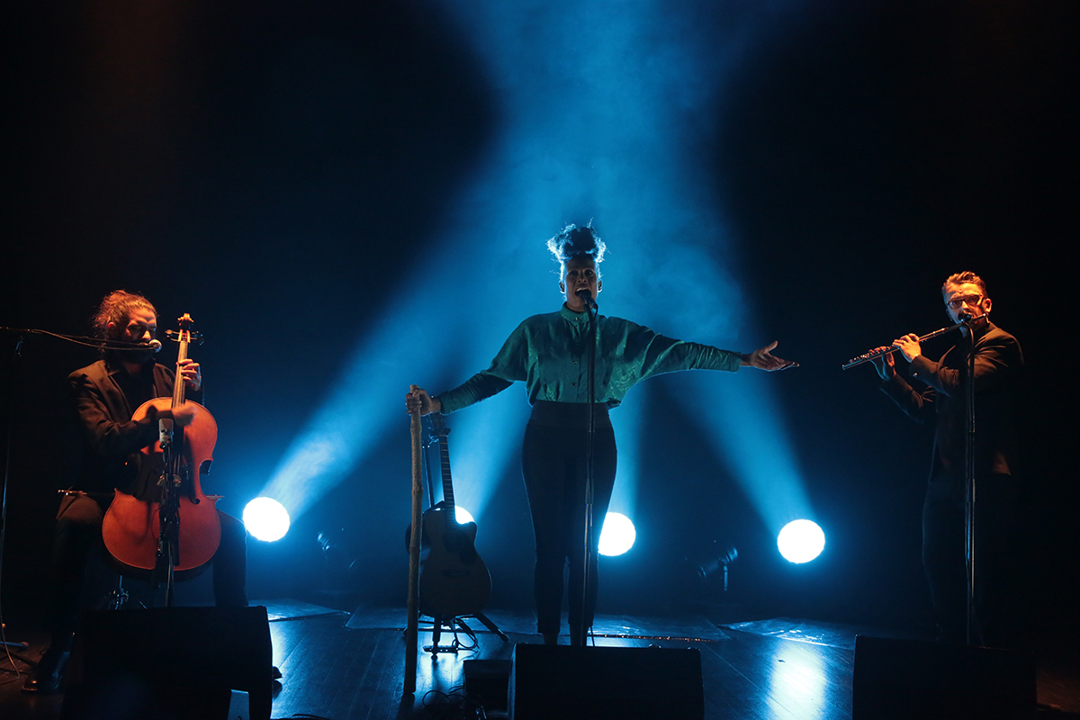 Prendre soin. Être à l’écoute. De soi, des autres. Quand Sandra Nkaké prend la parole dès les premiers instants de ce concert au centre culturel Jean Gagnant, elle crée une atmosphère propice à s’abandonner. Un endroit sûr, bienveillant, accueillant. Sa voix claire nous enveloppe dans un voile de douceur. Je soupire d’aise. Je me sens bien.