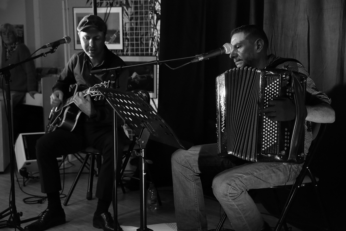 Quelques heures plus tard, Gaël Rouilhac et Gilles Puyfages jouent également le jeu des reprises dans la BFM de Beaubreuil, une fois de plus bondée. Au milieu de standards de la chanson française et du songbook américain, le guitariste et l’accordéoniste nous offriront deux morceaux que je prends pour leurs compositions, Diamant Rouge, qui est bien de Gaël Rouilhac et Indifférence, que je crois être de Gilles Puyfages alors qu’il s’agit d’un autre standard, de Tony Murena cette fois-ci. Je l’apprends bien plus tard de la bouche de Gilles. Et donc, je reste persuadé tout le concert qu’elle est de lui, cette Indifférence. Bien que l’on parle par exemple d’Astor Piazzolla, de Jacques Brel ou de Fats Waller, les autres reprises me semblent bien pâles en comparaison à l’interprétation de ces deux morceaux. Pas parce qu’elles sont fades, mais bien parce que le duo est transfiguré lorsqu’il joue ce que je crois être sa propre musique. Même si je sifflote ces airs bien connus en rentrant du concert, mon esprit est marqué par ces deux morceaux. Durant ces deux pièces, leur jeu me semble être plus dense, plus juste, plus grave. Je suis alors persuadé que le duo illustre parfaitement le fait qu’une reprise, aussi fantastique soit elle, ne pourra jamais offrir le même sentiment de découverte qu’un morceau entendu pour la première fois. En réalité, une reprise le peut, puisqu’Indifference me procure ces sensations. C’est la seule chose qui me manque cet après-midi, finalement. Je me languis de plus de leurs compositions, alors même que je n’ai jamais entendu celles de Gilles Puyfages. J’aimerais pouvoir entendre leurs voix plutôt que l’interprétation de celles d’un autre. Car ces voix-là cachent très certainement des trésors encore enfouis que je suis avide de découvrir.