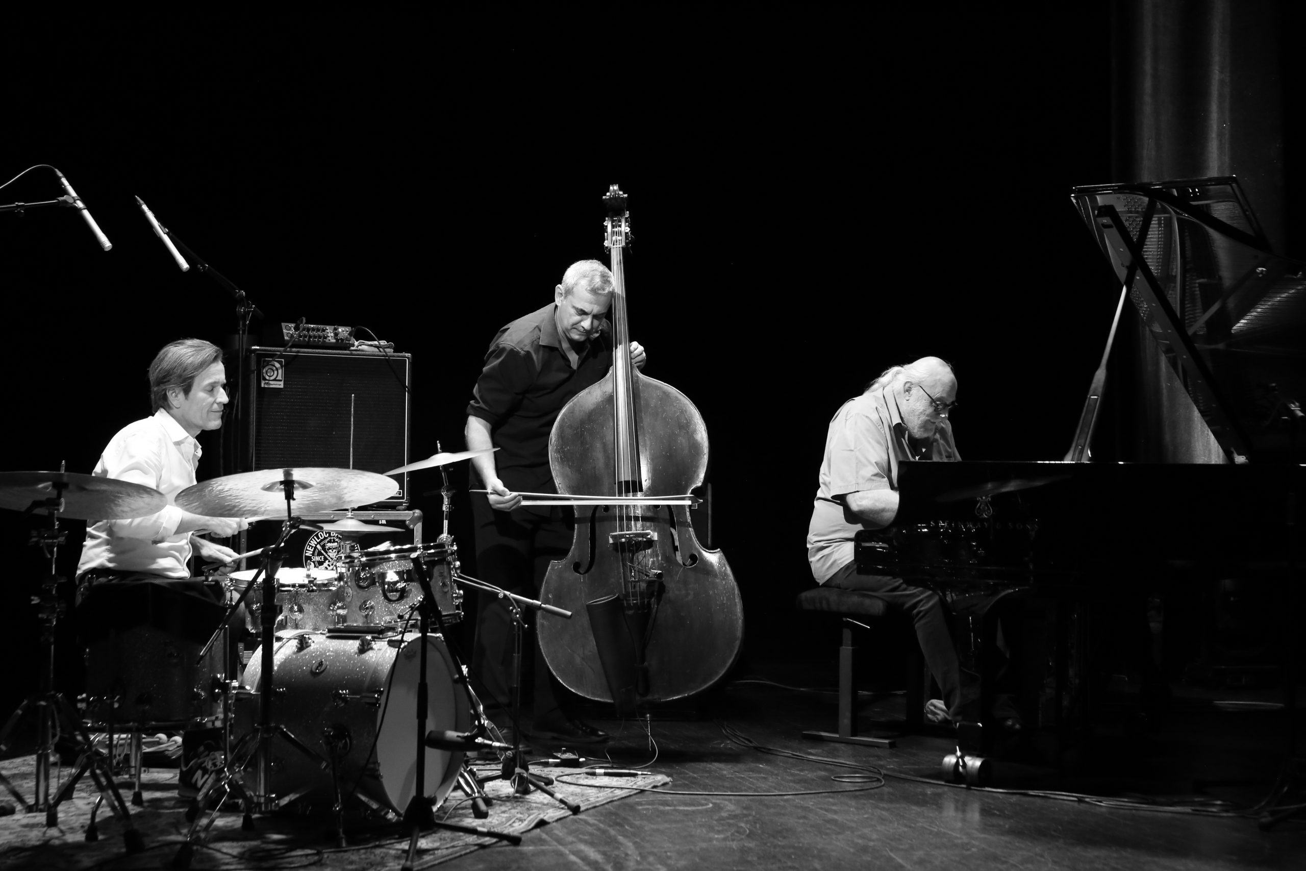 Après l’exposition, le concert, donc. Je me défais de ma nostalgie passagère pour me reconcentrer sur le présent. Devant moi, un trio que j’aime et que je connais, avec une définition de la musique à trois qui m’intrigue et me touche particulièrement. On oublie les suites de solos pris à tour de rôle, et on construit chaque instant ensemble, d’un seul souffle continu et ravageur. Me voilà installé confortablement, prêt à me prendre une belle rasade de poésie musicale improvisée.