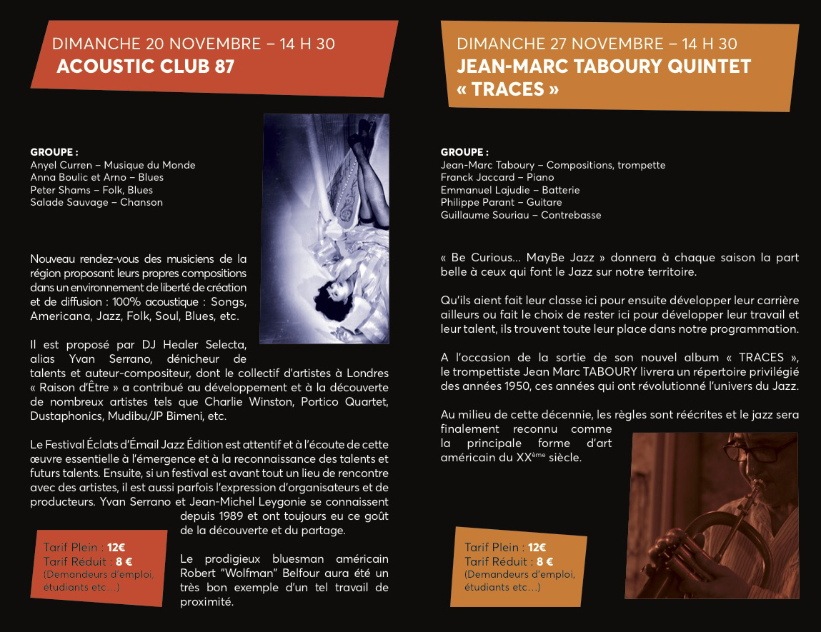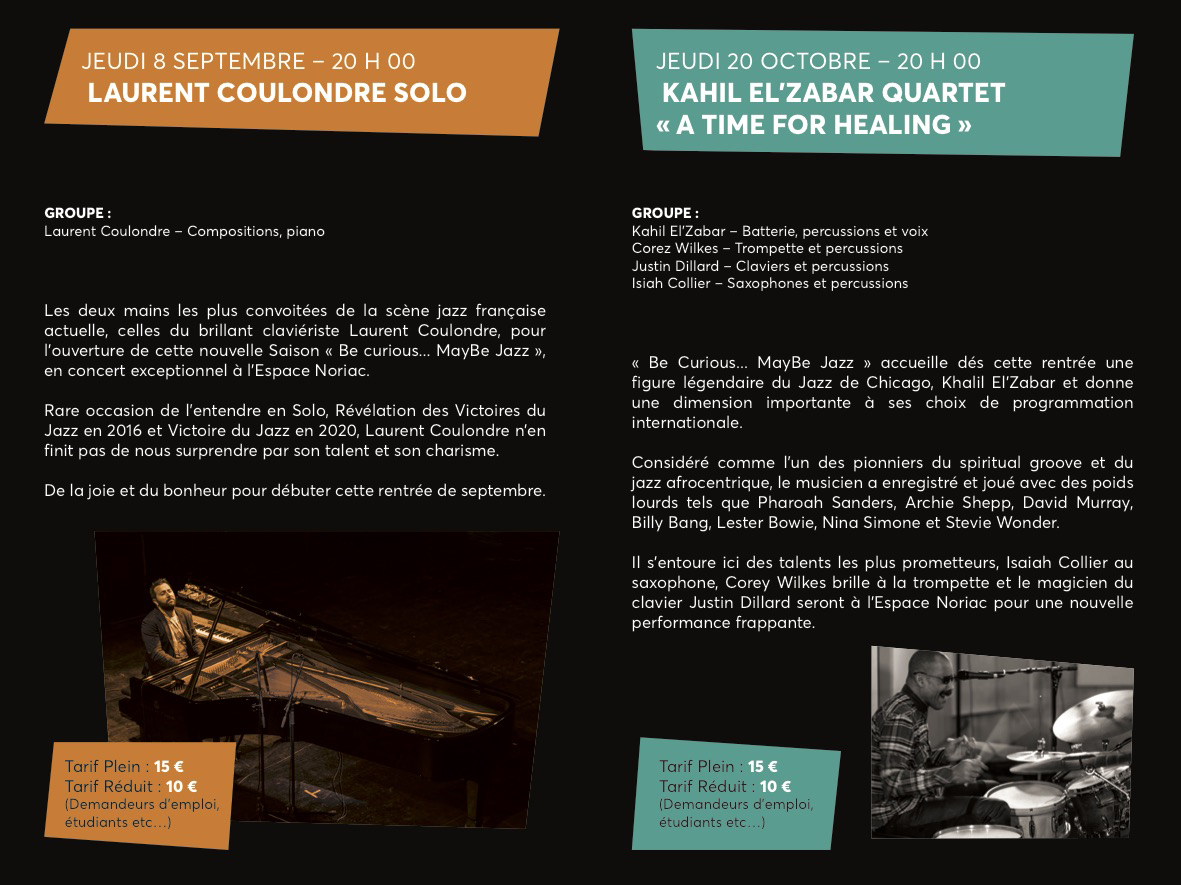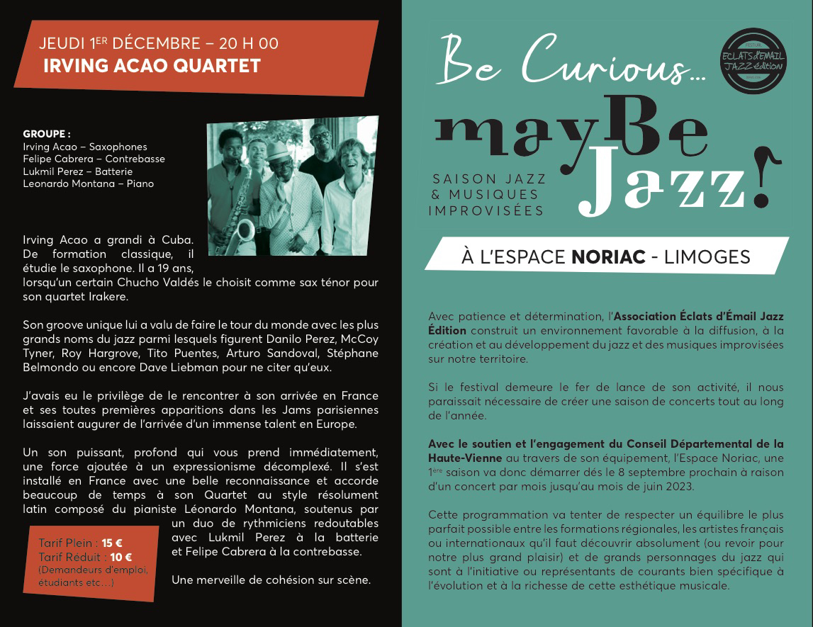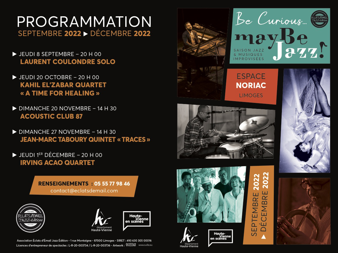 Patiently and resolutely, the Éclats D’Émail Jazz Édition association is building a favourable environment for the spreading, creation and development of jazz and improvised musics on our territory. Though the festival remains the spearhead of our activity, we found it necessary to create a season of concerts throughout the year. With the support and commitment of the Departmental Council of Haute-Vienne, through its facility, Espace Noriac, a first season will therefore start as of next September 8 at the rate of a concert a month until June 2023. This programming will try to respect a balance as perfect as possible between local bands, French or international artists that you must absolutely discover (or see again to our delight) and great figures of jazz that have initiated or represent very specific currents as for the evolution and richness of this musical aesthetics.