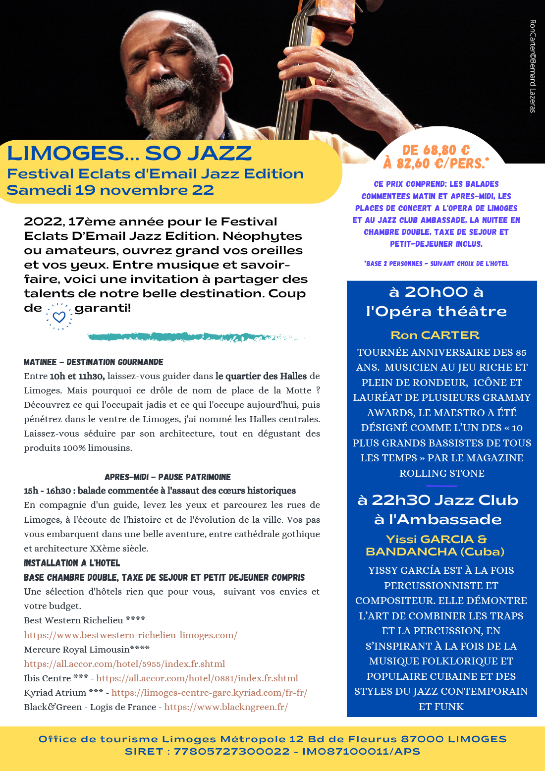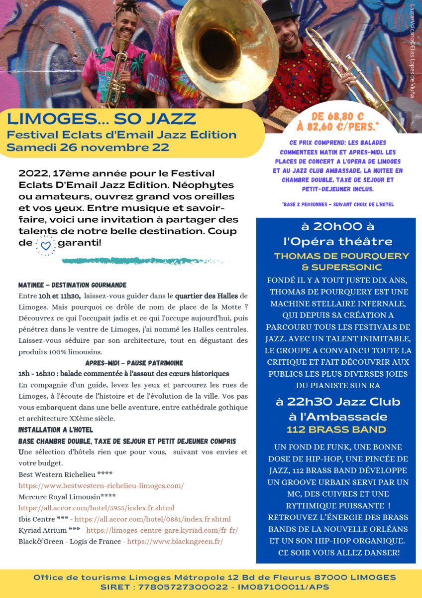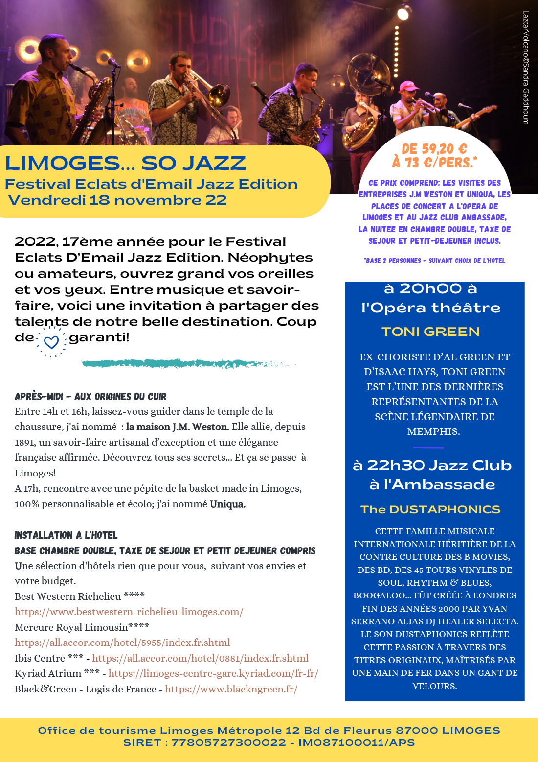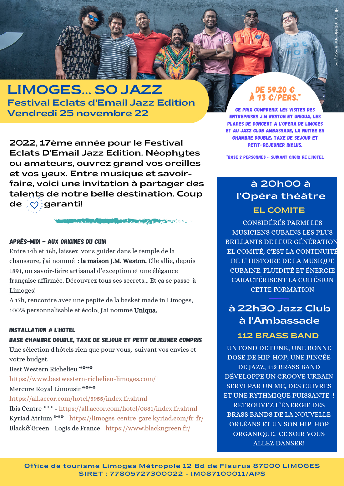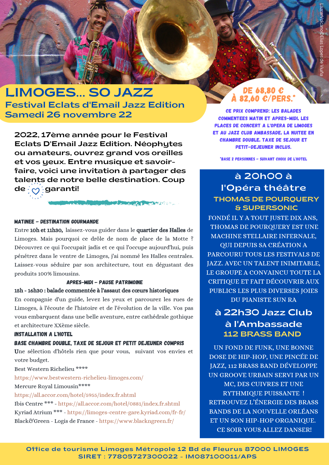 You are coming in greater numbers and from farther. Your numerous and precious feedbacks have pushed us and the Direction of the Joint Tourist Office of Limoges Métropole – Destination Limoges, to concoct you, as of this 2022 edition, four busy days of unusual tours both patrimonial and tasty, all of them to the rhythm of the festival. Limoges land of welcome and Land of Jazz … Be welcome.