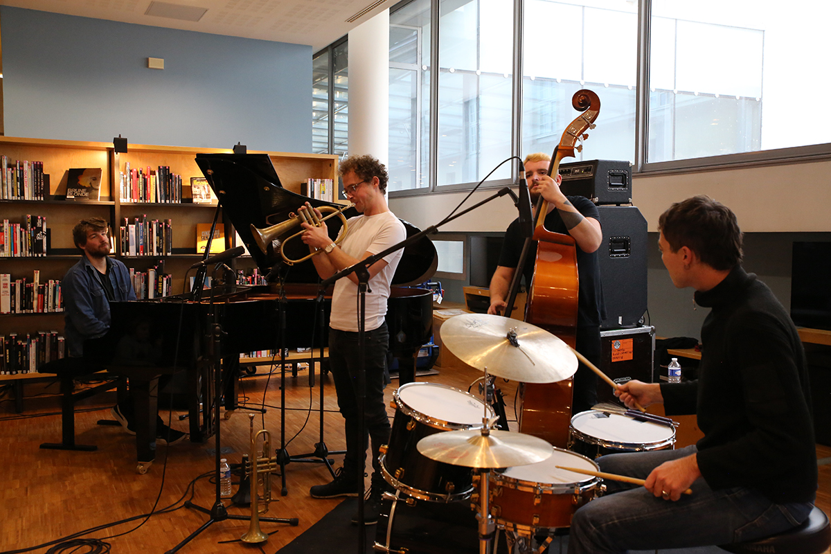J’évoquais hier la qualité des concerts gratuits de cette édition, et la prestation du Pan.Tone Quartet de ce matin ne fait pas exception. Le groupe est jeune, mais la qualité des compositions de Paul Bureau ne le fait pas transparaître un seul instant. Le pianiste possède une écriture d’une intelligence remarquable, qui sait aller à l’essentiel et surtout – et c’est bien là le plus important, grand égoïste que je suis – qui me touche particulièrement. L’apparente simplicité qui fait mouche, la sobriété qui fait jaillir l’élégance, ce quartet matinal me sort de la torpeur de ma trop courte nuit pour m’ancrer avec eux dans ce très beau moment. En conclusion, Martin Declercq nous offre un dernier éclat de grâce en faisant souffler son bugle près des cordes du piano de Paul Bureau à la manière d’Avishai Cohen. Cette avant dernière journée démarre sous les meilleurs auspices.